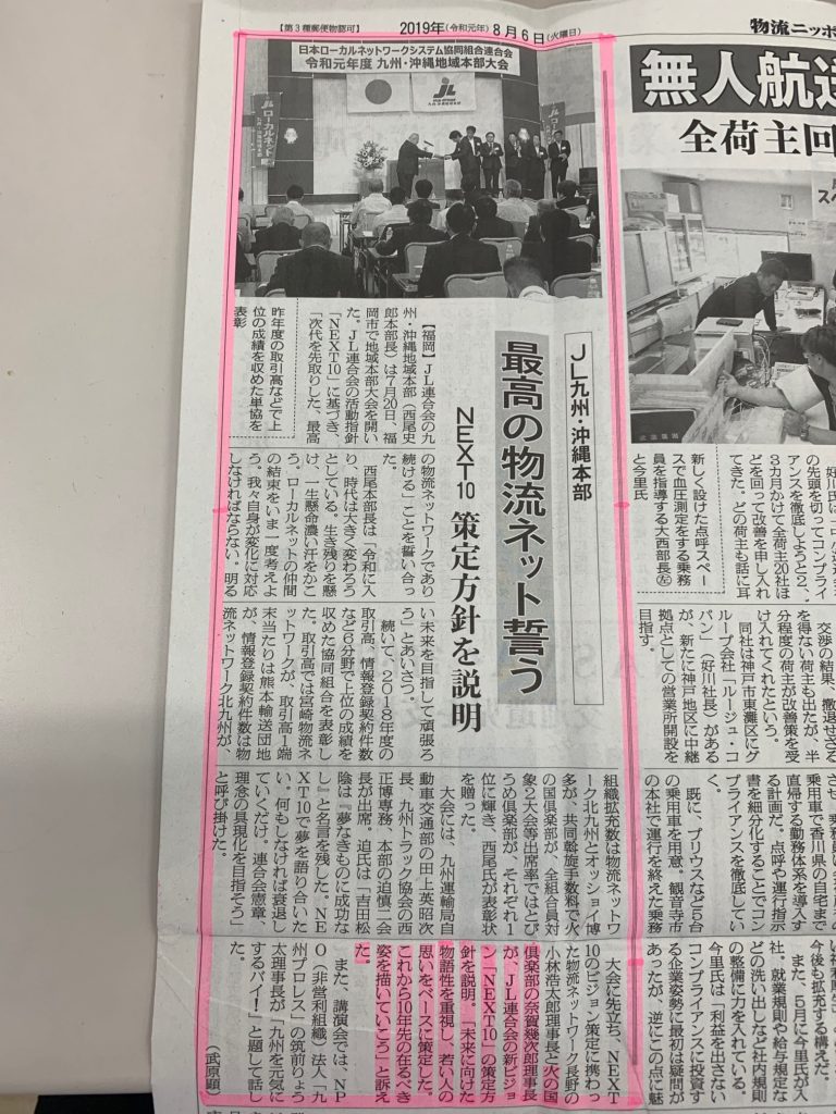 8/6の【物流ニッポン】の新聞記事に日本ローカルネットワークシステム協同組合(JL)連合会、7/20開催九州・沖縄地域本部大会の様子が掲載されていました。