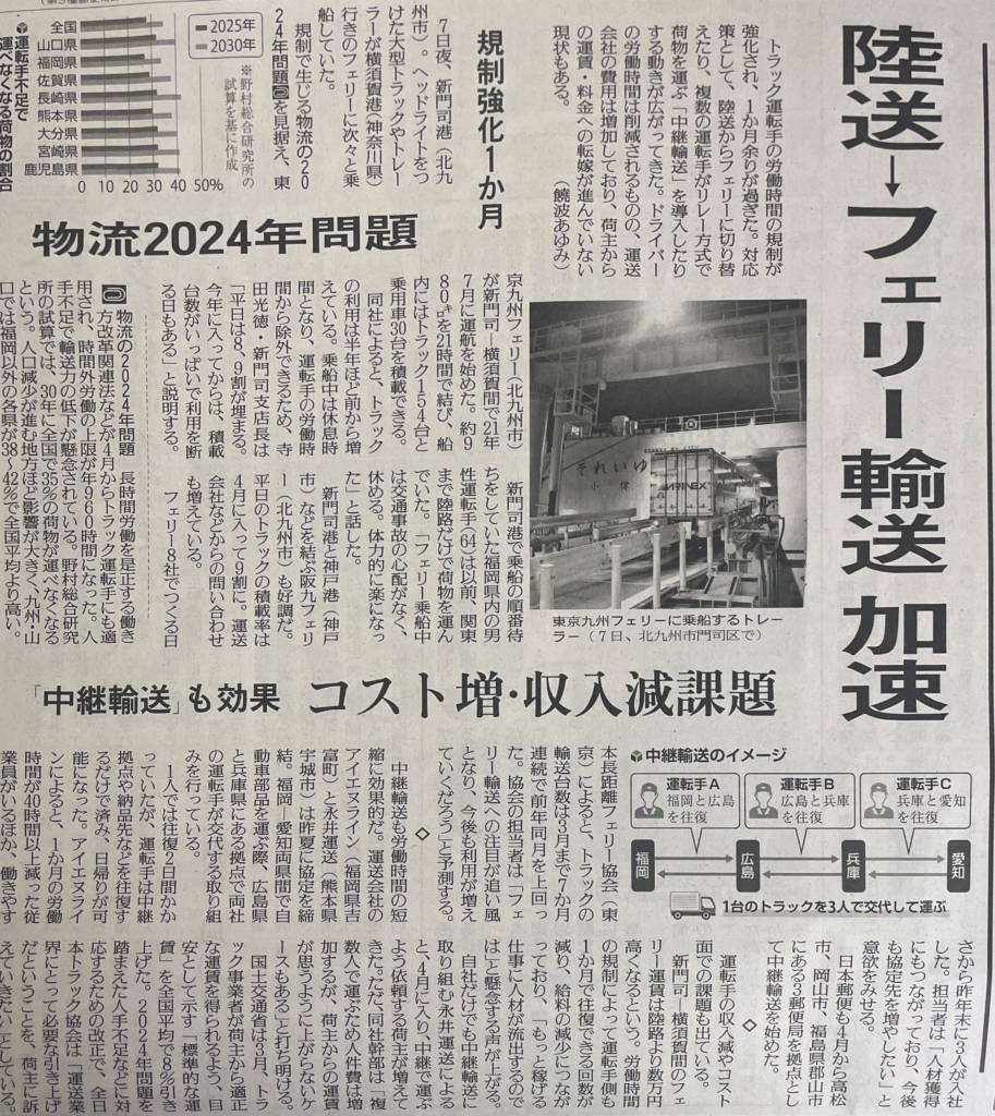 読売新聞に掲載されました。 2024.05.14 HOME ニュース 読売新聞に掲載されました。 Tweet 5月14日の読売新聞で2024年問題について取り上げられました。 アイエヌラインで働きませんか? アイエヌラインでは全国で仲間を募集しています。 女性も積極採用中です。詳しくは採用情報をご覧ください! 採用情報特設サイトはこちら 運輸安全マネジメント推進会議 2023年度下期全国拠点長会議 その他のお知らせ お知らせ一覧 2025.09.01 岩手営業所が誕生しました! 2025.07.05 2025.01.17 今年初めての納車が行われました🚚 2025.01.12 2025年総決起大会が開催されました。 2025.01.04 新年のご挨拶 2024.12.13 新車導入しました🚚 2024.12.12 北九州ゆめみらいワーク2024に出展しました! 2024.11.17 第20回アイエヌライン杯 2024.11.16 2024年度上期全国所長会議 2024.11.13 日本経済新聞の電子版記事に紹介されました📰