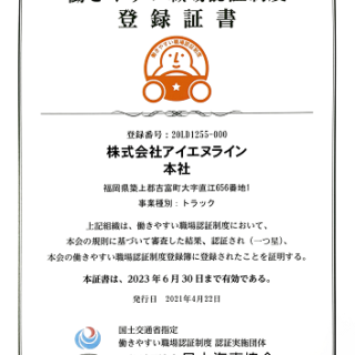 皆さん「働きやすい職場認証制度」はご存知でしょうか。 この制度は、職場環境改善に向けたトラック事業者の取組みを「見える化」すること...